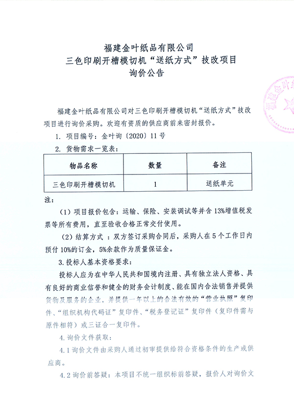 三色印刷開槽模切機(jī)“送紙方式”技改項(xiàng)目詢價(jià)公告