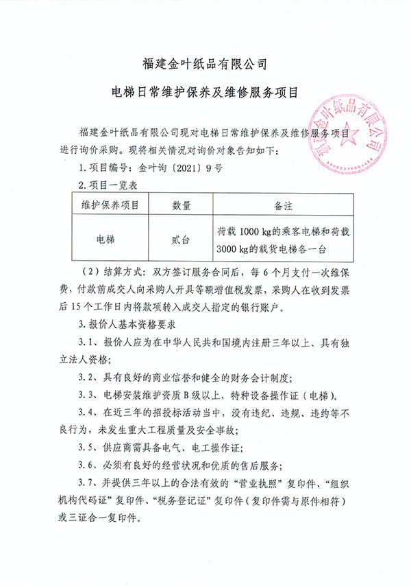 福建金葉紙品有限公司電梯日常維護保養(yǎng)及維修服務項目
