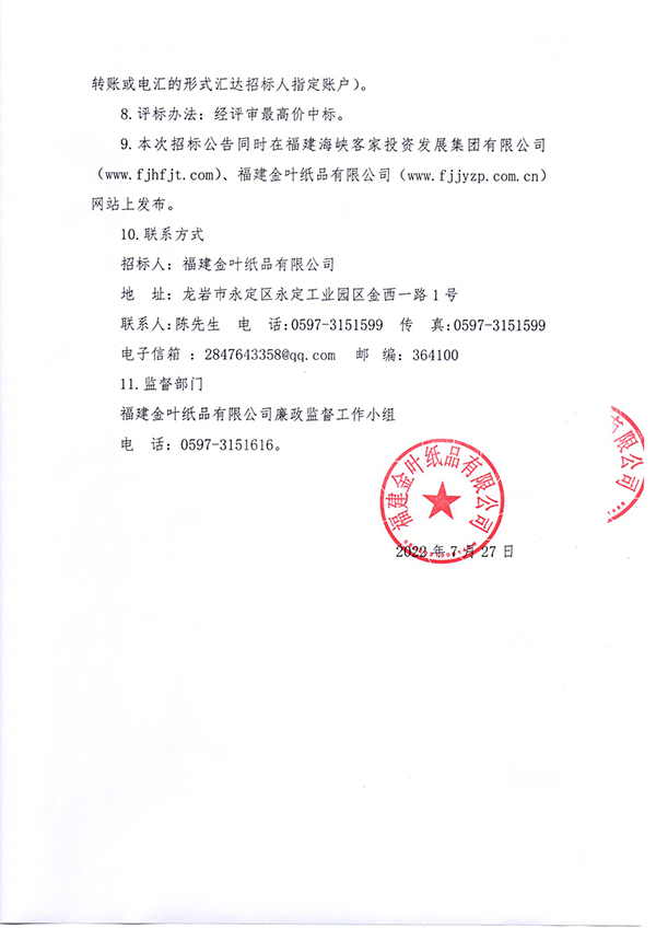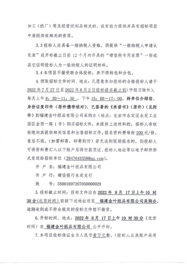 福建金葉紙品有限公司2022年度廢紙處置項目招標公告