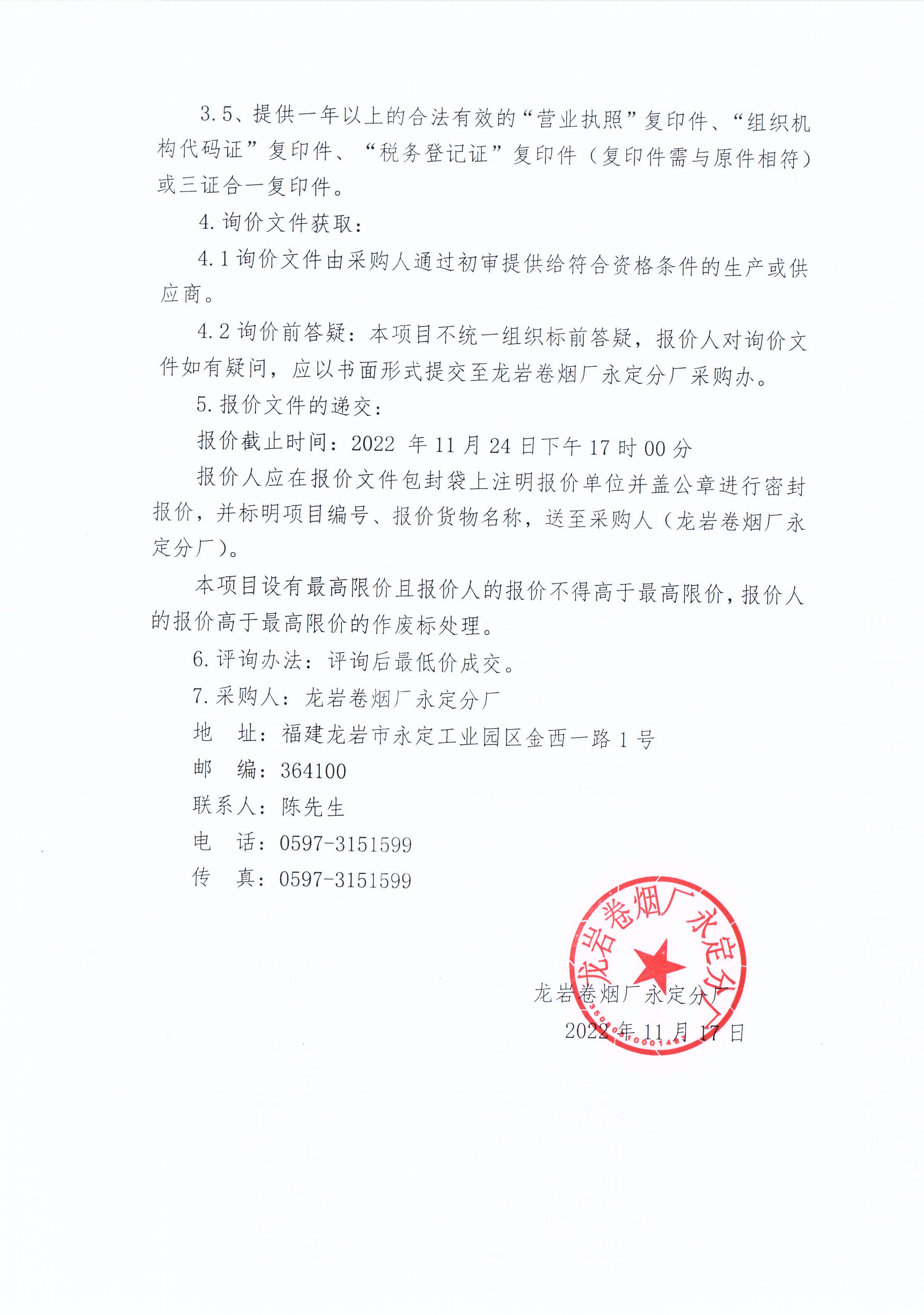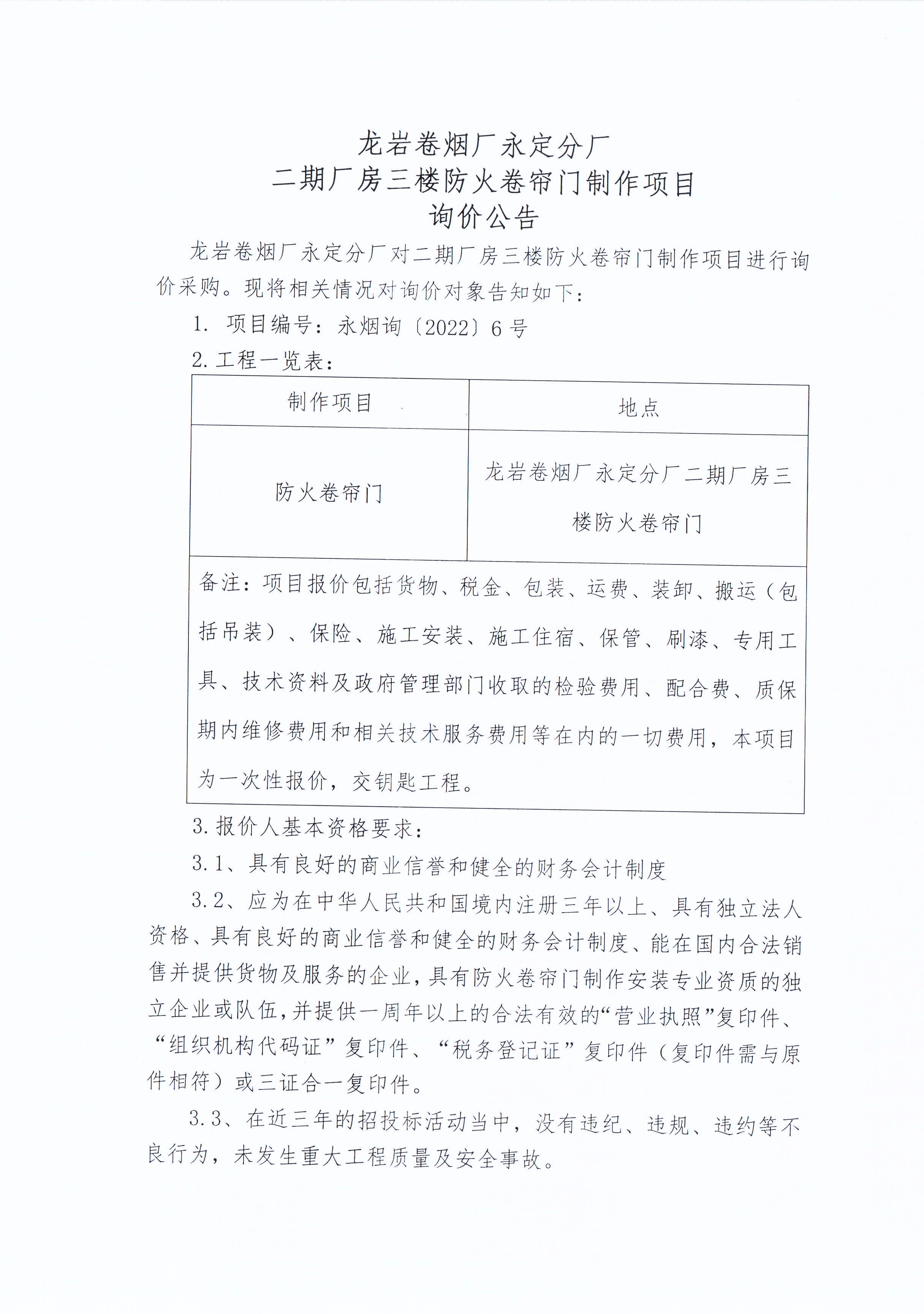 龍巖卷煙廠永定分廠二期廠房三樓防火卷簾門制作項(xiàng)目詢價公告
