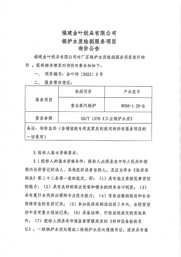 金葉紙品公司鍋爐水質(zhì)檢測(cè)服務(wù)項(xiàng)目詢價(jià)公告