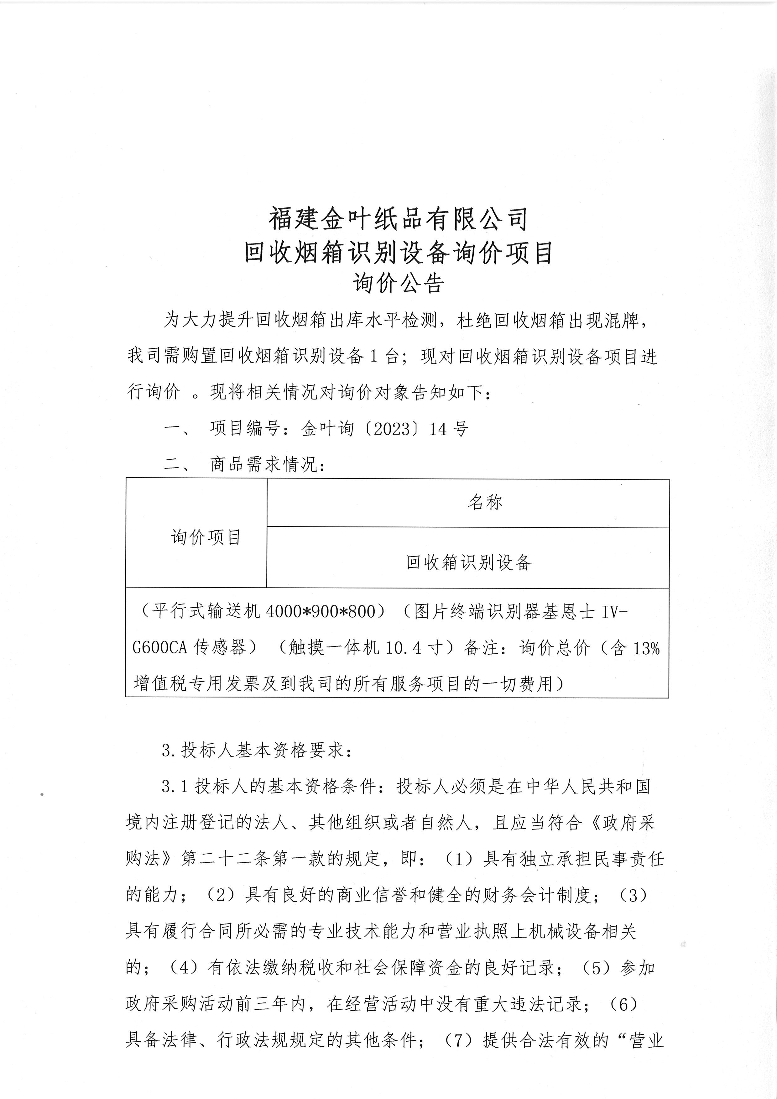 福建金葉紙品有限公司回收煙箱識別設備詢價項目
