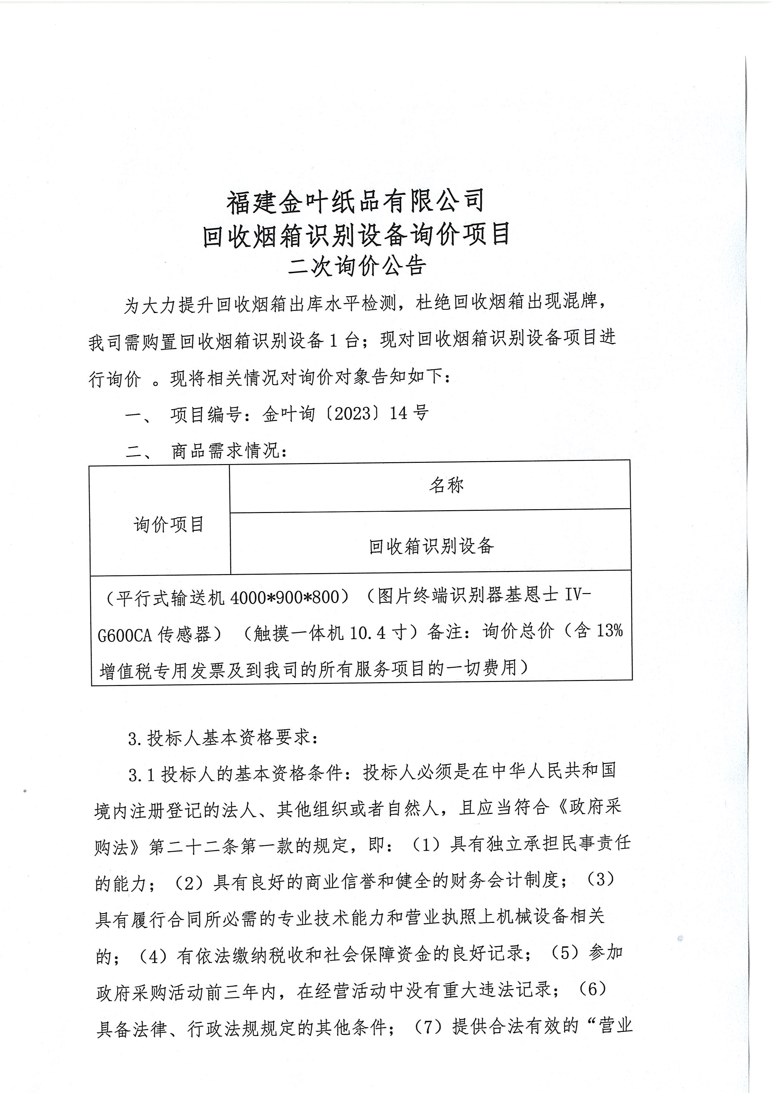 回收箱識別設備二次詢價公告