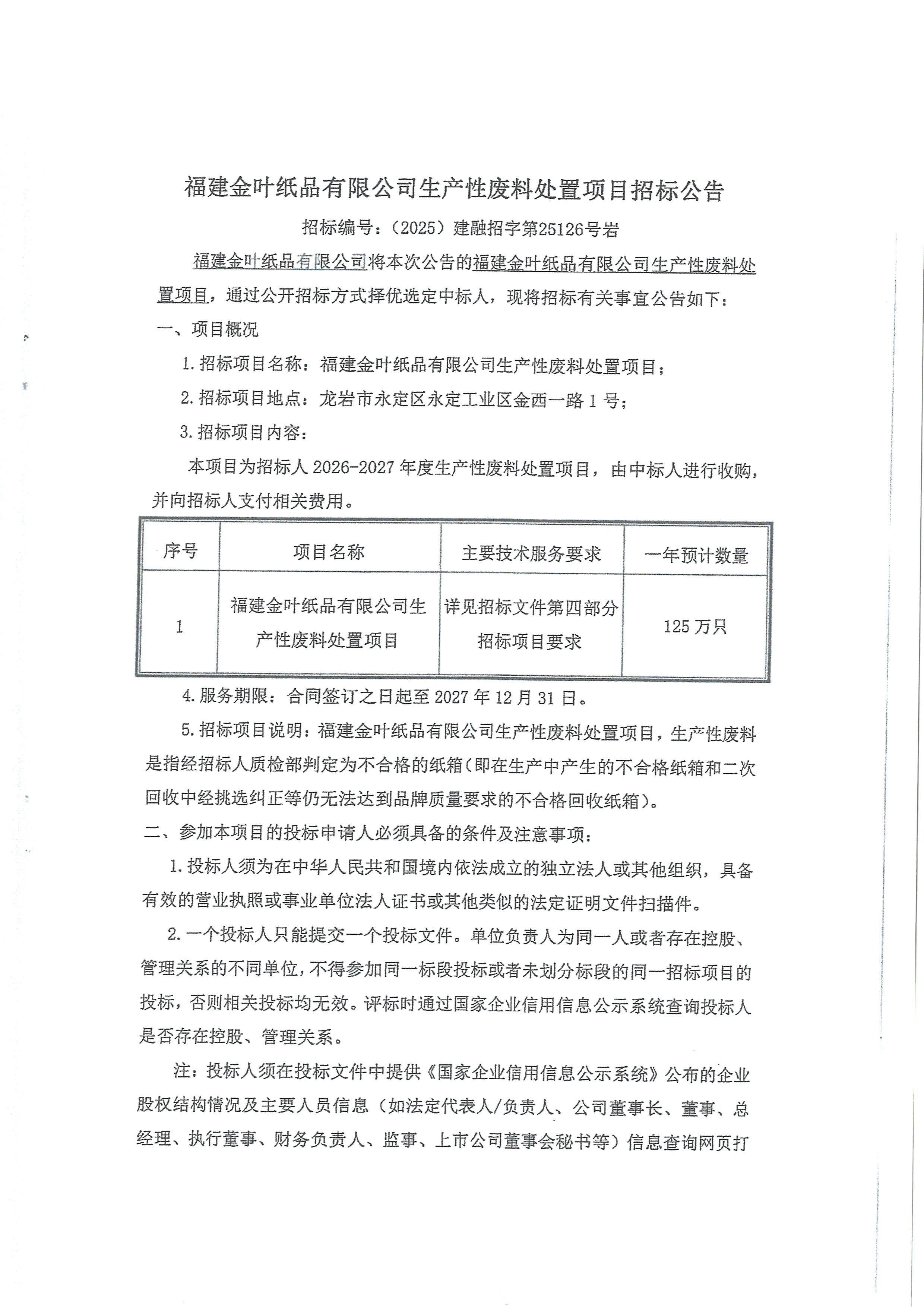 福建金葉紙品有限公司生產(chǎn)性廢料處置項(xiàng)目招標(biāo)公告